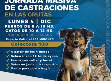 El lunes 4 de diciembre, en el Espacio Cultural “Les Mirones” (Colectora 730), se realizará una nueva jornada de castraciones masivas en la localidad de Las Grutas destinada tanto para perros como para gatos.
