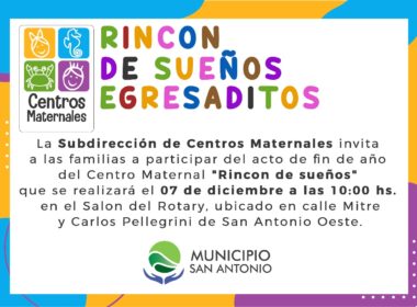 La Subdirección de Centros Maternales, dependiente de la Secretaría de Desarrollo Social, comunica que el miércoles 6 y jueves 7 de diciembre, se llevarán adelante los actos de fin de año de los jardines “Había Una Vez”, “Ardillitas Traviesas” y “Rincón de Sueños”.