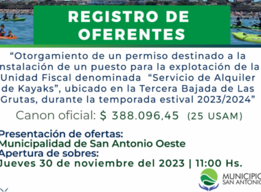 El Municipio San Antonio abre el llamado a Registro de Oferentes para el otorgamiento del permiso destinado a la instalación de un (1) puesto para la explotación de la Unidad Fiscal denominada “Servicio de Alquiler de Kayaks”, ubicado en la Tercera Bajada de Las Grutas, durante la temporada estival 2023/2024, […]