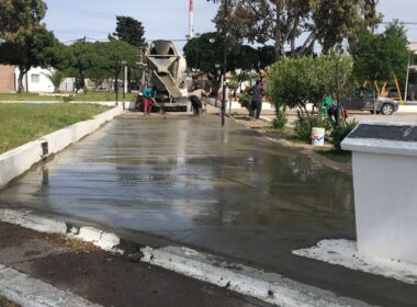 La Subsecretaría de Obras Públicas del Municipio San Antonio continúa con los trabajos para la puesta en valor de la Plaza Luis Piedrabuena de Las Grutas, donde se procede con las tareas de alisado de cemento sobre la vereda.