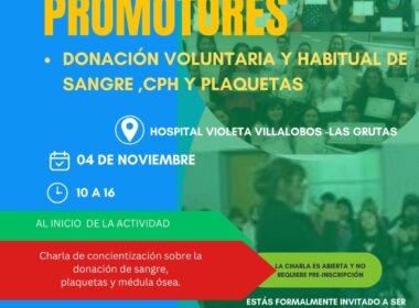 Este sábado 04 de noviembre de 10:00 a 16:00 hs en el Hospital Violeta Villalobos de Las Grutas, ubicado sobre la calle Buyayiski entre Pilcaniyeu y Río Colorado, se llevará adelante una charla de concientización sobre la donación de sangre, plaquetas y médula ósea.