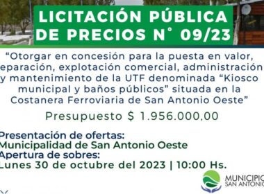El Municipio San Antonio realiza el Llamado a Licitación Pública N°009/2023, que tiene por objeto el otorgamiento de la concesión para la puesta en valor, reparación, explotación comercial, administración y mantenimiento de la Unidad Turística Fiscal denominada “Kiosco Municipal y Baños Públicos” de la Costanera Ferroviaria de San Antonio Oeste.