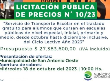El Municipio San Antonio realiza el Llamado a Licitación Pública N°010/2023, que tiene por objeto la prestación del “Servicio de Transporte Escolar en el traslado gratuito para los alumnos que cursan en las escuelas públicas de nivel especial, inicial, primario y medio, desde el mes de octubre hasta el mes […]