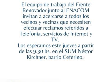 El Ente Nacional de Comunicaciones -ENACOM-, a través del equipo de trabajo del Frente Renovador, invita a los vecinos que quieran efectuar reclamos referidos a telefonía, internet, Tv, lo podrán hacer este jueves 17 de agosto a partir de las 9:30 hs en el SUM Néstor Kirchner del barrio Ceferino […]