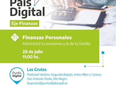 Este viernes 28 de julio en la sala del Punto Digital, ubicada sobre la Peatonal Viedma en la Segunda Bajada de Las Grutas (entre Allen y Conesa), se realizará una capacitación sobre “Finanzas Personales” en el marco de los talleres que brinda País Digital en el eje de finanzas.