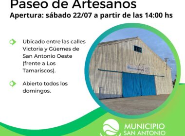 A través de la coordinación de la Dirección de Cultura, este sábado 22 de julio a partir de las 14:00 hs, en el predio ubicado entre las calles Victoria y Güemes (frente a Los Tamariscos) de San Antonio Oeste, se realizará la apertura del “Paseo de Artesanos” que tendrá abierta […]