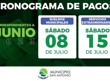 La Secretaría General de Coordinación Institucional del Municipio San Antonio, a cargo de Marcela Rossio, informa que el sábado 8 de julio estarán disponibles los salarios correspondientes al mes de junio para la administración pública municipal.