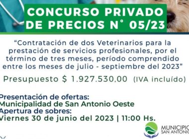 El Municipio San Antonio realiza el Concurso Privado de Precios N° 005/2023 que tiene por objeto la contratación de dos (2) veterinarios para la prestación de servicios profesionales, por el término de tres (3) meses, período comprendido entre los meses de julio – septiembre del año 2023.