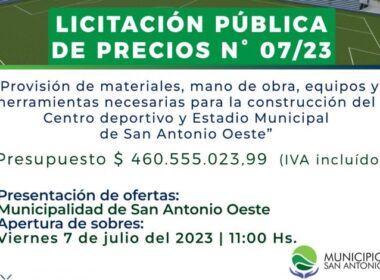 El Municipio San Antonio realiza el Llamado a Licitación Pública N°007/2023, que tiene por objeto la provisión de materiales, mano de obra, equipos y herramientas necesarias para la construcción del Centro deportivo y Estadio Municipal de la localidad de San Antonio Oeste.