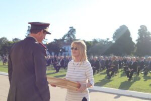 Tras los sones de la Diana del Parque, tuvo lugar una muy emotiva entrega de reconocimientos a los familiares de los cabos “en comisión” de la promoción 1982 caídos en combate: Roberto Adrián Bustos, Oscar Eduardo Labalta y Luis Omar González. Ellos demostraron alto valor y dieron sus vidas desinteresadamente por amor a la Patria.