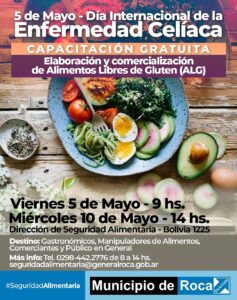 El 5 de Mayo próximo, con motivo de conmemorarse el Día Internacional de la Enfermedad Celíaca la Dirección de Seguridad Alimentaria realizará una serie de Capacitaciones con el objetivo de sensibilizar y compartir pautas acerca de los cuidados necesarios al momento de la elaboración y comercialización de Alimentos Libres de Gluten (ALG).