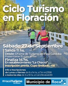 El Municipio de Roca, a través de la Dirección de Turismo, propone para el próximo sábado 27 de septiembre una excursión de Ciclo Turismo, donde se realizará un circuito productivo por caminos rurales hasta el establecimiento rural “La Chacra”, para registrar el momento de la floración en manzanos y perales.