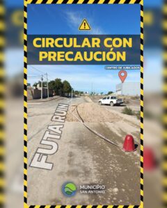 Se solicita circular con extrema precaución por la intersección de las calles Futa Ruin y El Caín, en Las Grutas, debido a que el área de Coordinación de Servicios Públicos se encuentra realizando tareas de relleno y nivelación en el sector.