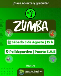 Además, el mismo sábado 03/08 pero en el Polideportivo Municipal de San Antonio Este, habrá clases de Zumba desde las 15:00 hs. También de carácter libre y gratuito.