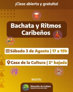 La Dirección de Cultura invita a la comunidad a participar de las clases abiertas y gratuitas de Bachata y Ritmos Caribeños, que tendrá lugar el día sábado 03/08 de 17:00 a 19:00 hs en la Casa de la Historia y la Cultura de Las Grutas (Segunda Bajada).