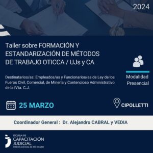 En la ciudad de Cipolletti ha iniciado el Taller sobre Formación y Estandarización de Métodos de Trabajo – OTICCA / UJs y CA, coordinado por el Dr. Alejandro Cabral y Vedia. Este taller está destinado a empleados/as y funcionarios/as de Ley de los Fueros Civil, Comercial, de Minería y Contencioso Administrativo de la IVta. Circunscripción Judicial.