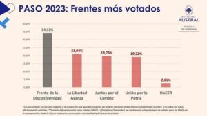 Otro de los datos analizados es que tanto el ausentismo como la disconformidad lograron en las PASO 2023 la mayor diferencia histórica sobre el candidato más votado y el frente más elegido (8,51% y 13,27%, respectivamente) estableciendo un “preocupante” record que abre interrogantes sobre la concurrencia y el comportamiento del electorado en las elecciones generales 2023.