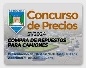 La Municipalidad de General Roca llama a Concurso de Precios Nº 51/2024, correspondiente a la “Compra de repuestos para camiones”.