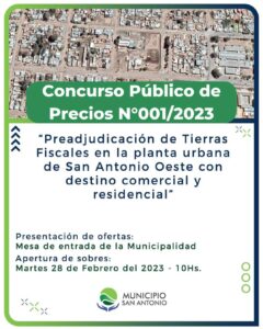 El Municipio San Antonio realiza el llamado a Concurso Público de Precios N°001/2023 que tiene como objeto el ofrecimiento de la preadjudicación de Tierras Fiscales en la planta urbana de San Antonio Oeste con destino comercial y residencial, detallado en el anexo.
