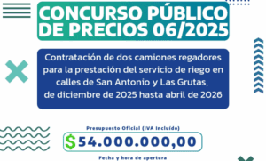 El Municipio San Antonio realiza el llamado a Concurso Público de Precios N°006/2025, que tiene por objeto la contratación de dos (2) camiones regadores para la prestación del servicio de riego en calles de tierra: uno destinado a la planta urbana de San Antonio Oeste y otro a la planta urbana de Las Grutas, desde su adjudicación en el mes de diciembre de 2025 y hasta abril de 2026 inclusive.