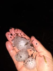 Desde la red social de un conocido comercio dedicado a la comercialización de plantas y flores se compartieron imágenes de los daños ocasionados por la granizada. En ellas se puede observar el inusual tamaño de las piedras caídas y los daños ocasionados.