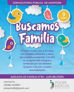 Si desean más información sobre la convocatoria pueden contactarse con el Juzgado de Familia de Luis Beltrán, celular: 2946-412592 en el horario de 7.30 a 13.30 horas en días hábiles y/o por correo electrónico a adopcionlb@gmail.com