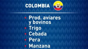 Argentina -actual campeón de América y del Mundo de fútbol- posiciona en Colombia gran variedad de productos agrícolas. Puntualmente, en lo que va del año, el Senasa certificó la exportación de 2.212 toneladas de productos de origen animal hacia ese destino, como productos aviares y bovinos. Además de 513.402 toneladas de productos de origen vegetal, como granos de trigo, cebada, maíz, garbanzo y poroto; aceite y harina de soja, y pera y manzana entre los más destacados.
