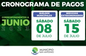 La Secretaría General de Coordinación Institucional del Municipio San Antonio, a cargo de Marcela Rossio, informa que el sábado 8 de julio estarán disponibles los salarios correspondientes al mes de junio para la administración pública municipal.