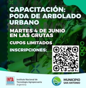 La Subsecretaría de Desarrollo Sustentable conjuntamente con el Instituto Nacional de Tecnología Agropecuaria -INTA-, dictarán el próximo martes 4 de junio un curso destinado a la “Poda de Arbolado Urbano” de forma gratuita en Las Grutas, con el objetivo de consolidar y expandir el conocimiento sobre la poda adecuada de los árboles siendo dirigido a podadores informales, agentes de instituciones y empresas prestadoras de servicios.