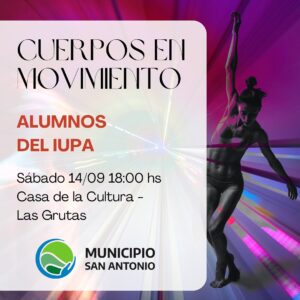 La Dirección de Cultura, a cargo de Marcela Lal, invita a la comunidad a la muestra de danzas “Cuerpo en movimiento”, interpretado por los alumnos del Instituto Universitario Patagónico de las Artes -IUPA-, y luego presenciar la voz del cantante Máximo Gutiérre, uno de los ganadores de Talento Rionegrino.