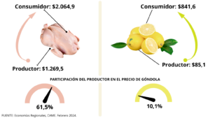En promedio, la participación del productor explicó el 28% de los precios de venta final. La mayor participación la tuvieron los productores de pollo (61,5%), mientras que la menor fue para los de limón (10,1%).