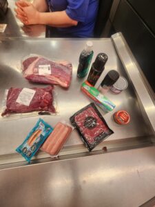 Al solicitar la exhibición del contenido de la mochila, se constató la presencia de varios artículos alimenticios y de higiene personal, entre ellos paquetes de carne, fiambres, embutidos, desodorantes, pasta dental y detergente, los cuales no habían sido registrados en la compra.