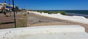 Se perimetró el lugar, delimitándolo con cinta de peligro, tanto en zona de playa como aproximadamente 20 metros de vereda en Av Costanera a la altura de calle Cervantes ya que se pudo notar aproximadamente 6 metros de vereda y baranda de hormigón descalzada.