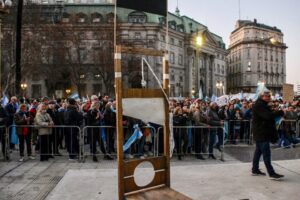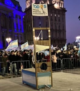 La guillotina, como exhibición, continúa una serie de expresiones de ese tono en las marchas de la oposición. En 2021, durante la pandemia de Covid-19, se mostraron bolsas mortuorias con los nombres de varios referentes del Frente de Todos, mientras que en el tractorazo del 23 de abril de este año pudieron verse muñecos con los rostros del presidente Alberto Fernández y la vicepresidenta Cristina Kirchner colgados de una horca.