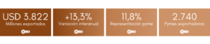 El 34,2% (USD 1.305,7 millones) de las exportaciones de las pymes argentinas tuvieron a Sudamérica como principal destino, destacando Brasil y Chile como los socios más importantes.