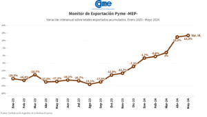 Así surge del Monitor de Exportación Pyme (MEP), un indicador elaborado por el sector de Estadísticas e Informes de la Confederación Argentina de la Mediana Empresa (CAME), para medir las exportaciones de las pequeñas y medianas empresas de la República Argentina. La medición es en base al monitoreo mensual de las operaciones de las empresas argentinas en el comercio exterior, discriminando por su condición pyme declarada ante la Secretaría de la Pequeña y Mediana Empresa, Emprendedores y Economía del Conocimiento, dependiente del Ministerio de Economía de la Nación.