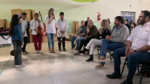 La entrega de instrumentos se llevó adelante en la Primaria de Jornada Extendida N°316, sede de la Orquesta. Allí las y los estudiantes de 1° ciclo,que asisten a un taller de escritura e inglés, le realizaron obsequios al ministro que dan cuenta del trabajo de alfabetización que han realizado en esa propuesta.