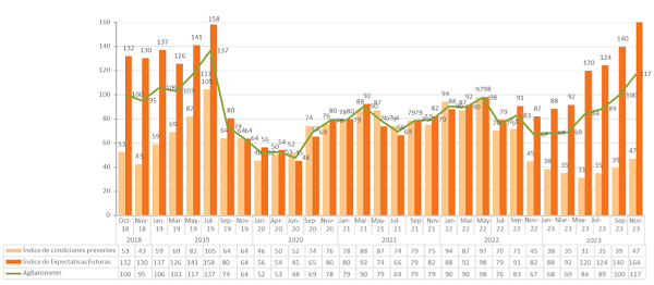 Rosario, Santa Fe; enero de 2024 – El último Ag Barometer Austral noviembre/diciembre de 2023, que elabora el Centro de Agronegocios y Alimentos de la Universidad Austral, alcanzó un valor de 117 puntos, lo que representa no solo una suba del 17% con respecto a la medición pasada, sino también un incremento del 74% en términos interanuales si se lo compara con noviembre 2022.