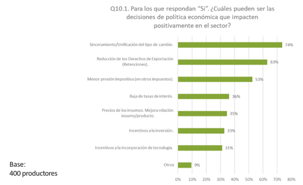 La encuesta también indica que, si bien los productores estiman que pueden eliminarse las retenciones (derechos de exportación), se acepta que el proceso sea gradual, ya que en el corto plazo el objetivo prioritario del gobierno es la eliminación del déficit fiscal y resulta muy difícil renunciar a recursos fiscales genuinos para no tener que recurrir al impuesto inflacionario.