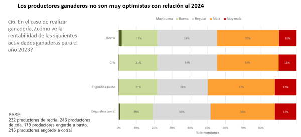 Entre quienes reina el pesimismo es entre los productores ganaderos que, en general, no tienen buenas expectativas con respecto al 2024, producto del arrastre del 2023 donde, al igual que en el sector agrícola, la sequía afectó considerablemente las actividades ganaderas.