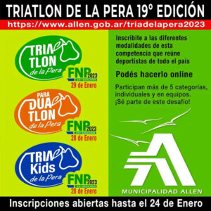 En el último fin de semana del mes, rionegrinos y rionegrinas podrán disfrutar en Allen del Triatlón de la Pera, uno de los eventos deportivos más destacados de la provincia en lo que será su edición número 19.