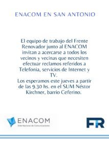El Ente Nacional de Comunicaciones -ENACOM-, a través del equipo de trabajo del Frente Renovador, invita a los vecinos que quieran efectuar reclamos referidos a telefonía, internet, Tv, lo podrán hacer este jueves 17 de agosto a partir de las 9:30 hs en el SUM Néstor Kirchner del barrio Ceferino de San Antonio Oeste.