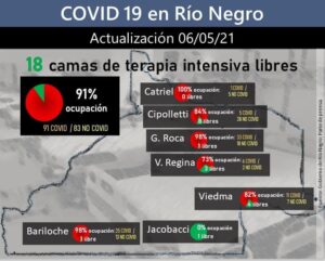 Esta semana las camas de terapia de intensiva llegaron a su límite en varias localidades. Los últimos datos dan cuenta de que existen apenas unas 18 UTI libres de las 188 que existen en la Provincia, lo que representa el 91 por ciento. En Catriel, por ejemplo está la ocupación 100 por ciento; en Cipolletti, 84 por ciento, con 8 camas libres; en Roca, 98 por ciento con sólo una cama libre; en Regina 73, por ciento con 3 libres; en Viedma, 82 por ciento con 4 libres; en Bariloche, 98 por ciento con una libre y en Jacobacci está libre la única existente.