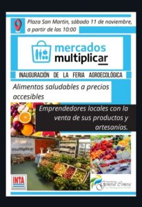 Este sábado 11 de noviembre a partir de las 10:00 hs, en la Plaza San Martín, se realizará la inauguración de la feria agroecológica a través del Mercado Multiplicar, con el objetivo de crear un punto de venta de alimentación saludable a precios accesibles.