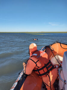 Inmediatamente, personal a bordo de un semirrígido se dirigió al lugar indicado y, una vez localizada la víctima, se la asistió, mientras flotaba sobre su equipo de neoprene, y se la abordó en la embarcación de la Institución.