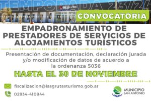 Desde la Dirección de Fiscalización Turística, dependiente de la Agencia de Turismo y Cultura, se informa que se está llevando a cabo el “Empadronamiento de PRESTADORES Y ADMINISTRADORES de Servicios de Alojamientos Turísticos de Las Grutas, San Antonio Oeste y el Puerto del Este”.
