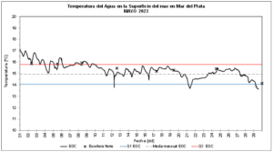 El Gabinete de Oceanografía Física del Instituto Nacional de Investigación y Desarrollo Pesquero (INIDEP) informó la temperatura del agua en la superficie del mar en Mar del Plata durante mayo de 2023.