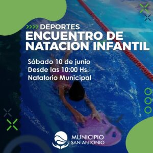 La Dirección de Deportes del Municipio San Antonio informa que este sábado 10 de junio a partir de las 10:00 hs dará inicio el Encuentro Infantil de Escuelas de Natación en el Natatorio Municipal de SAO.