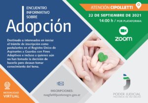 Esta semana se llevará a cabo un nuevo “Encuentro Informativo sobre Adopción”, organizado por el Registro de Aspirantes a Guarda con Fines Adoptivos de la IV Circunscripción Judicial. Contará con la participación de profesionales de Cipolletti..