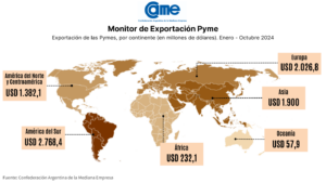 Así surge del Monitor de Exportación Pyme (MEP), un indicador elaborado por el sector de Estadísticas e informes de la Confederación Argentina de la Mediana Empresa (CAME) para medir las exportaciones de las pequeñas y medianas empresas de la República Argentina, en base al monitoreo mensual de las operaciones de las empresas nacionales en el comercio exterior. Se discrimina por su condición pyme declarada ante la Secretaría de la Pequeña y Mediana Empresa, Emprendedores y Economía del Conocimiento, dependiente del Ministerio de Economía de la Nación.